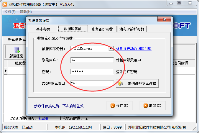 網(wǎng)絡版請在“亞拓軟件應用服務器”程序中,點菜單“文件”-》“系統(tǒng)參數(shù)設置”,在數(shù)據(jù)庫參數(shù)中輸入下圖所示的參數(shù):