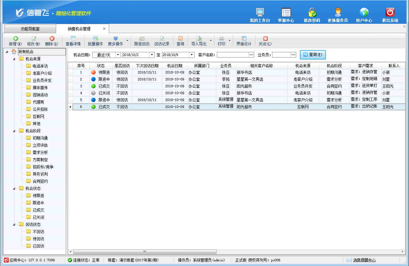銷售機會管理:用于管理在推銷過程中,由于環境發生變化,給銷售人員提供的實現其推銷目的的一種可能性,可以對銷售機會進行跟進回訪并查詢回訪記錄。