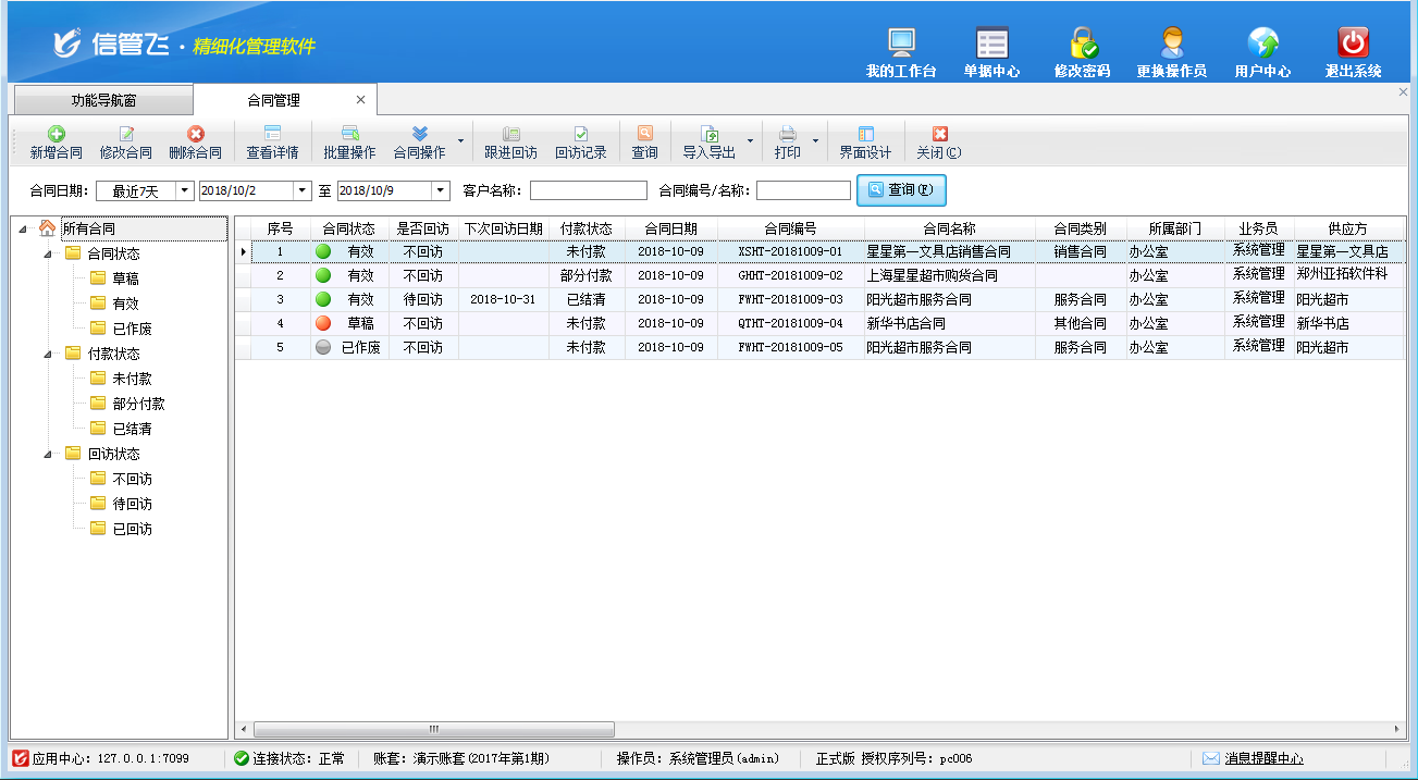 合同管理:用于管理銷售合同、購貨合同、服務合同等各類合同。可以對合同進行執行階段管理(待審核、有效、已作廢)和跟進回訪。支持管理合同付款狀態,并支持分期付款的情況。