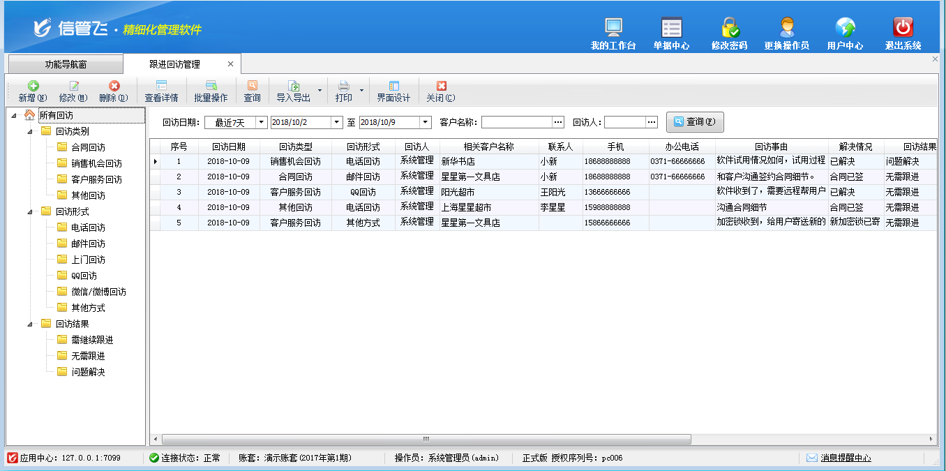 跟進回訪管理:用于管理對銷售機會、合同、客戶服務單等進行跟蹤回訪,回訪包括電話回訪、郵件回訪、短信回訪、上門回訪、QQ/微博/微信回訪等各種形式。支持對未解決的回訪進行再次跟蹤回訪。