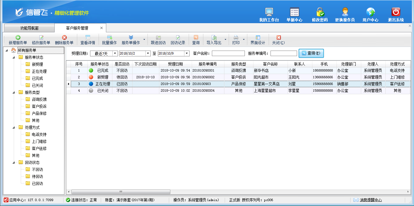 客戶服務管理是了解與創造客戶需求,以實現客戶滿意為目的,企業全員、全過程參與的一種經營行為和管理方式,主要是針對企業單位開發新客戶及維護老客戶形成的一個對客戶的聯系、服務、售后,形成定期的管理記錄檔案。軟件支持流程化的客戶服務管理,包括受理、分派、服務完工、跟蹤回訪等完整客服流程管理,能最大限度地使客戶滿意,使企業在市場競爭中贏得優勢,獲得利益。