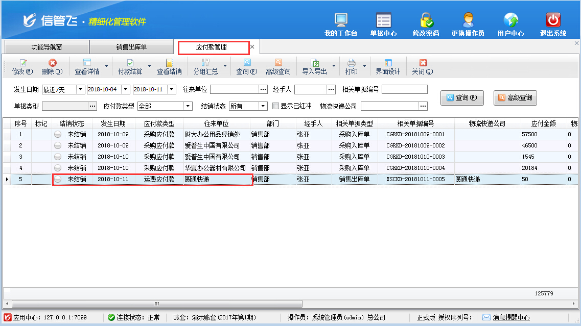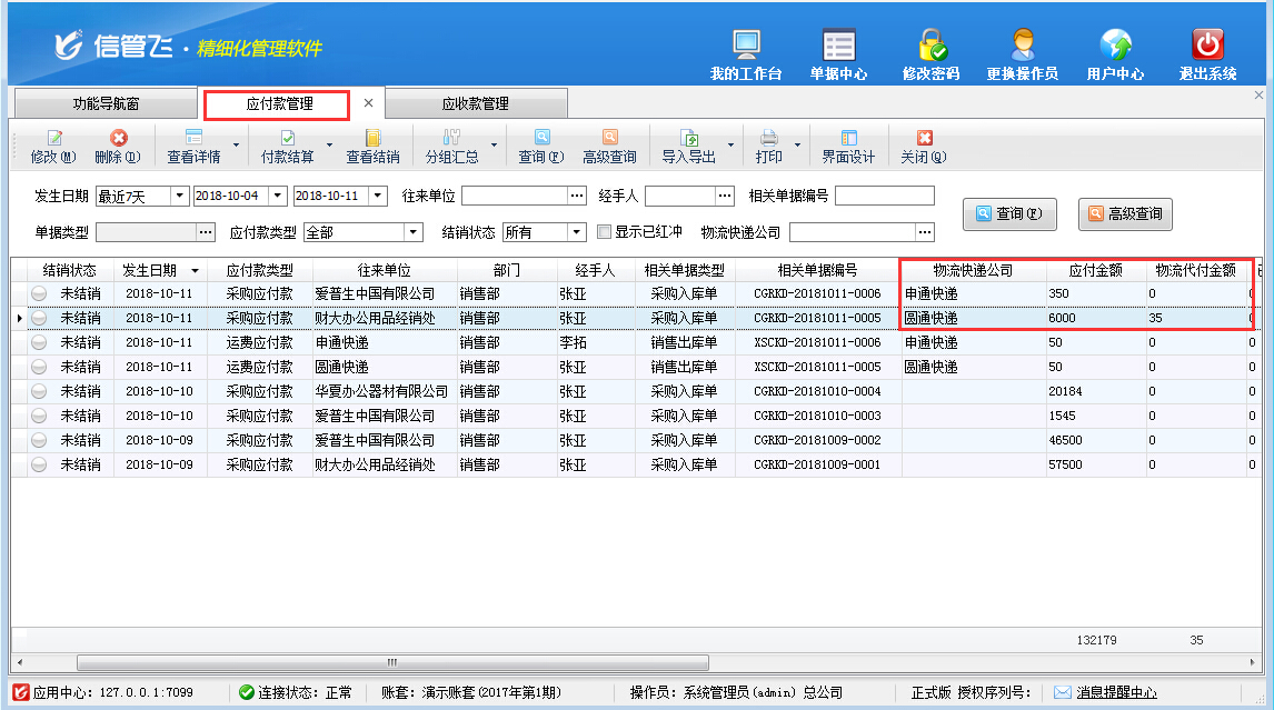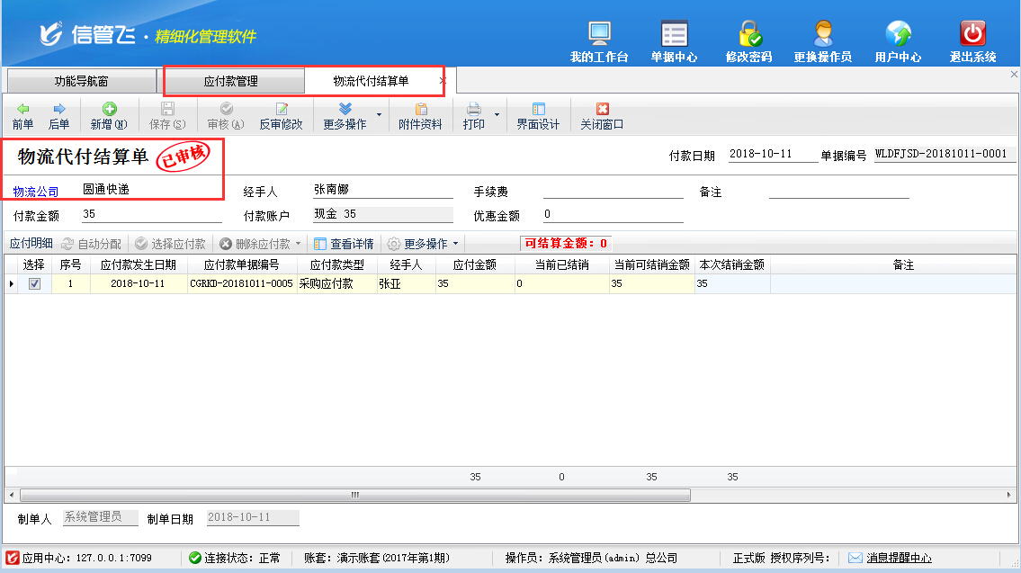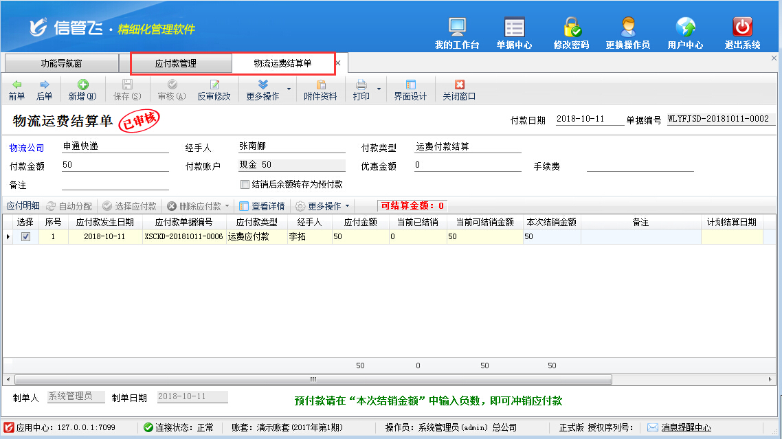 物流運費結算功能包括:物流運費應付款結算、物流運費代付結算、物流運費代收結算 在往來管理—》應付款管理中進行運費應付款結銷且對應生成物流運費結算單。