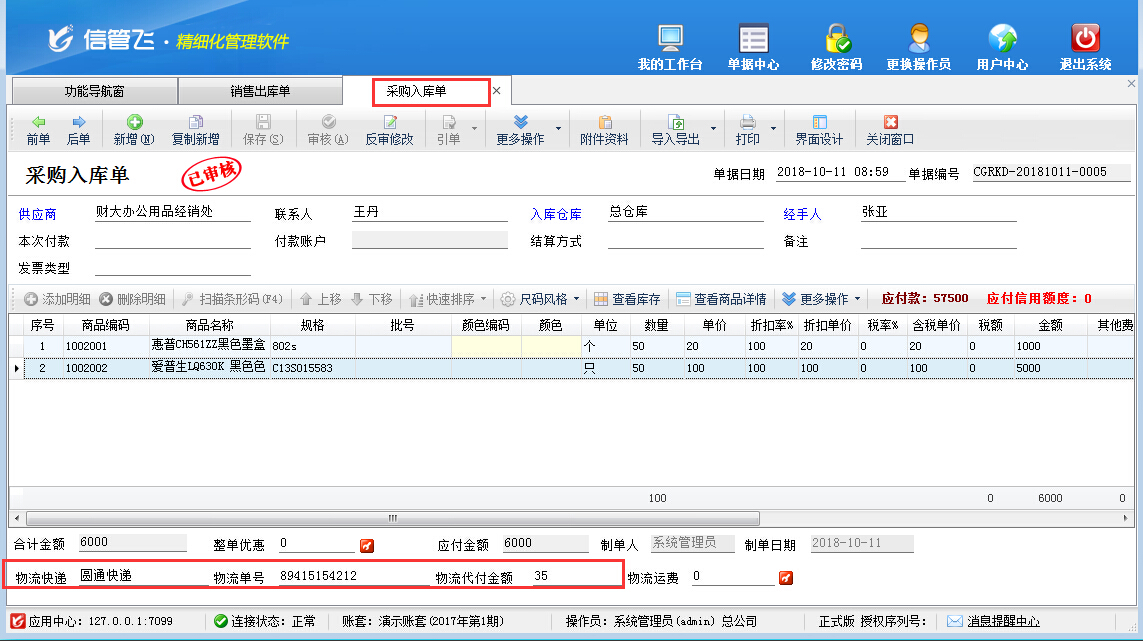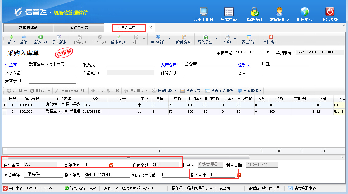 采購入庫單中物流運費輸入有2種形式:采購入庫的運費計入應付款或者不計入應付款,相關設置可以在系統管理—》系統業務參數中進行配置(默認計入應付款)。