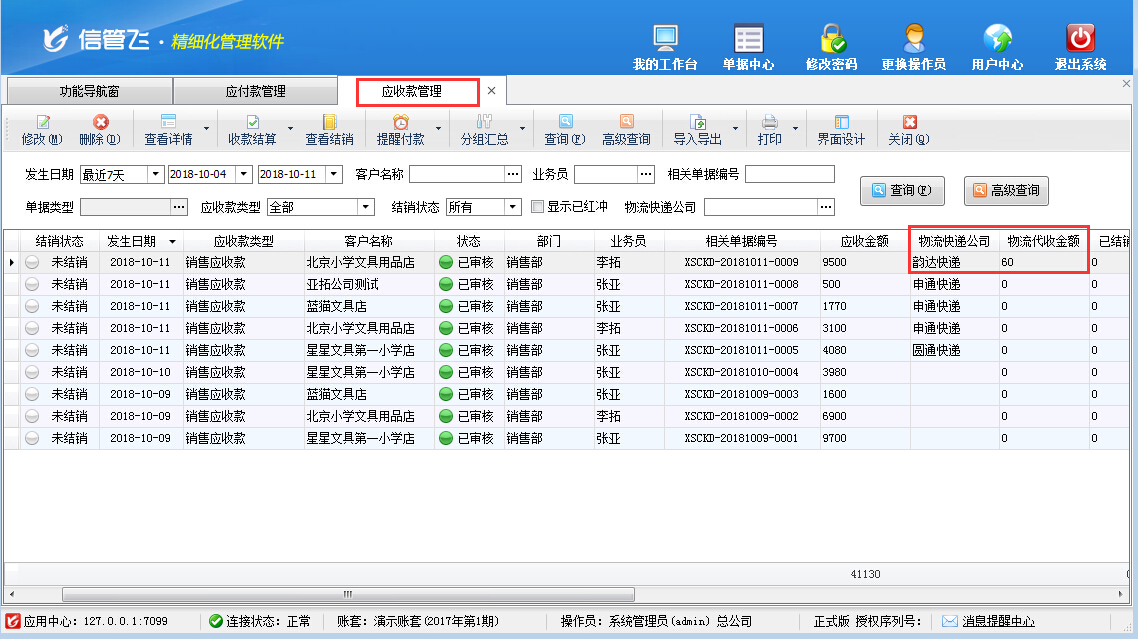 功能描述:物流運費結算功能通過在銷售出庫單和采購入庫單中輸入物流快遞運費金額和物流快遞運費代收金額、代付金額。對生成的運費應付款、運費代付金額和代收金額可以在往來管理應收應付款管理中進行結算操作。支持定期結算(如月結)和付現款的情況。