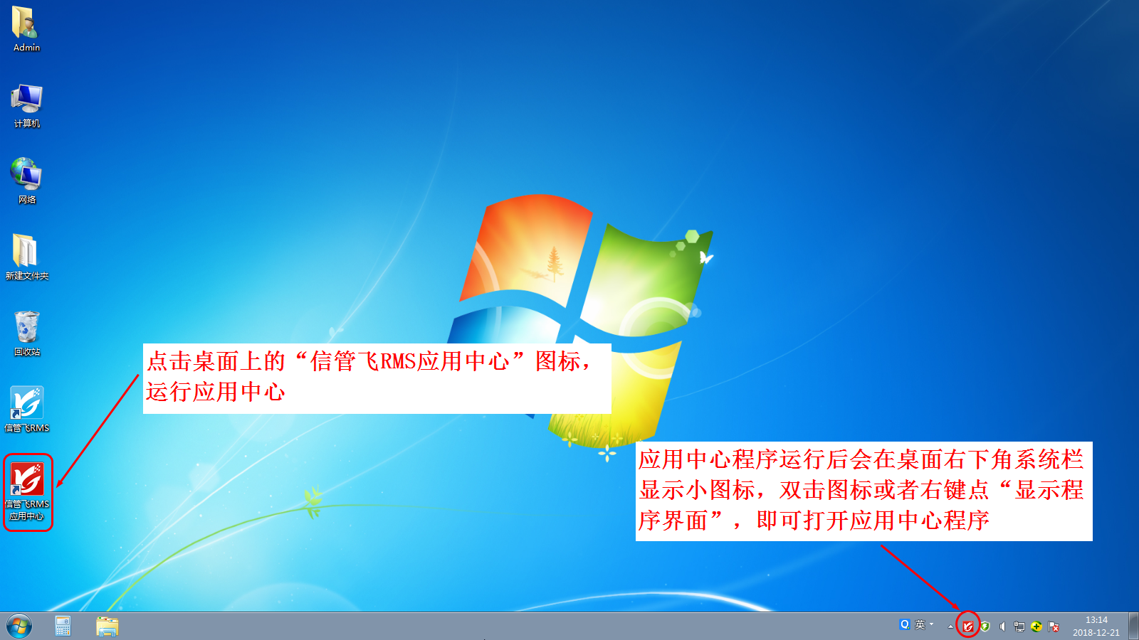 ????主機電腦開機且運行“信管飛應(yīng)用中心”程序:點擊桌面上的“信管飛RMS應(yīng)用中心”程序圖標(或者在開始菜單中點擊相應(yīng)功能),即可打開應(yīng)用中心程序。應(yīng)用中心程序運行后會在桌面右下角顯示應(yīng)用中心圖標: