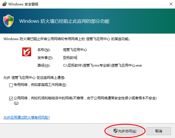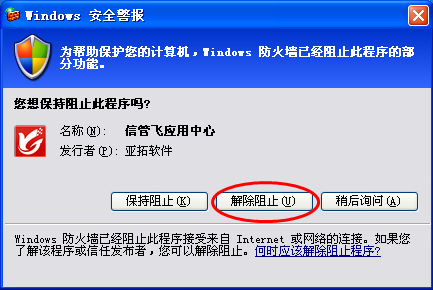 ????首次運行應(yīng)用中心程序,如果防火墻彈出提示窗口,則Win7系統(tǒng)請點擊“允許訪問”按鈕允許訪問;WinXP系統(tǒng)請點擊“解除阻止”按鈕即可。