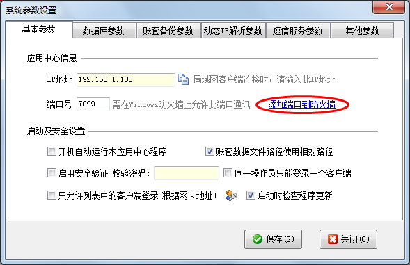 ????主機電腦的Windows防火墻或其他安全軟件的防火墻上需要開放相應(yīng)的端口,軟件支持自動添加防火墻規(guī)則。在應(yīng)用中心程序點“系統(tǒng)參數(shù)”可以設(shè)置自動添加端口到防火墻。