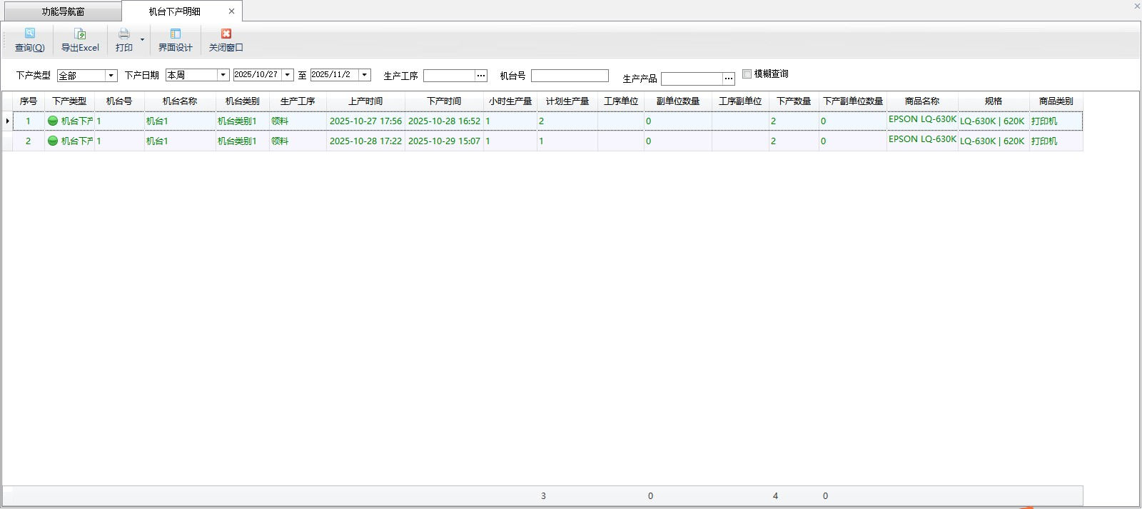機臺下產明細查詢:可根據生產工序、生產產品、機臺號、下產狀態等條件查詢某個時間段內,工序本次計劃生產量、下產數量。