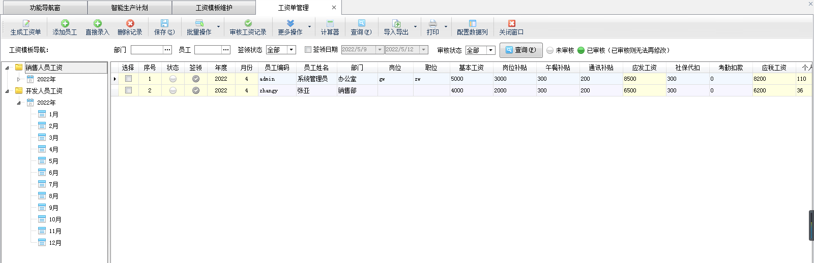 保存工資單:生成工資單之后,可以錄入基本工資、崗位補貼、考勤扣款等工資項目,然后軟件根據設置的工資模板計算出員工相應的應發工資及實發工資。點擊“保存”按鈕,即可保存工資單數據。