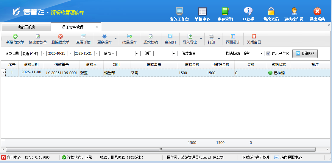????在功能導航窗點擊“綜合管理”—》“員工借款管理”即可進入“員工借款管理”界面,如下圖所示:
