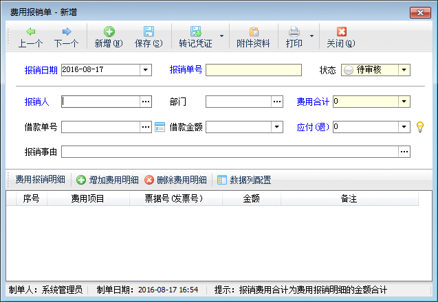 ????錄入報銷日期、報銷人、費用合計、應付(退)等必填項后保存單據即可,報銷單號保存后自動生成。