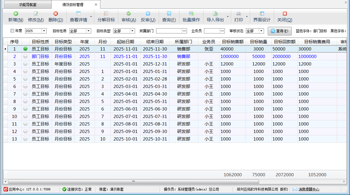 查詢:可以根據(jù)年度、目標(biāo)性質(zhì)、目標(biāo)類型、部門、業(yè)務(wù)員及審核狀態(tài)等條件查詢績(jī)效目標(biāo)記錄。
