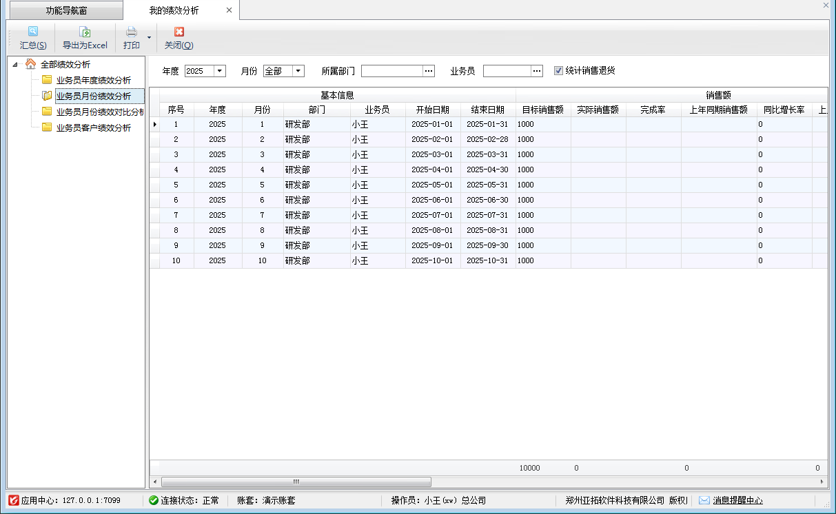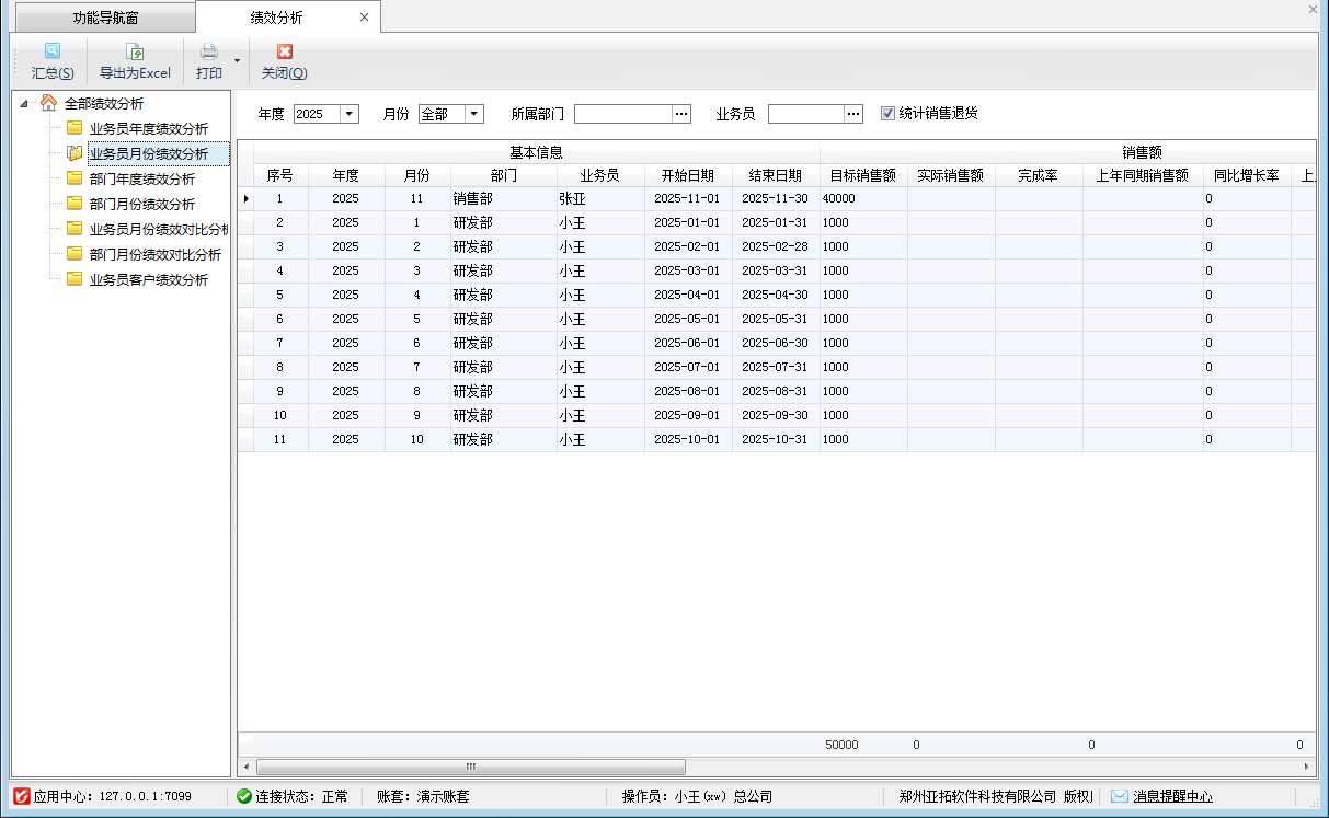 ????在功能導(dǎo)航窗點(diǎn)擊“績(jī)效考核”——“績(jī)效分析”,即可進(jìn)入到績(jī)效分析界面,包含業(yè)務(wù)員年度績(jī)效分析、業(yè)務(wù)員月份績(jī)效分析、部門年度績(jī)效分析、部門月份績(jī)效分析、業(yè)務(wù)員月份績(jī)效對(duì)比分析、部門月份績(jī)效對(duì)比分析、業(yè)務(wù)員客戶績(jī)效分析等,其界面如下圖所示。