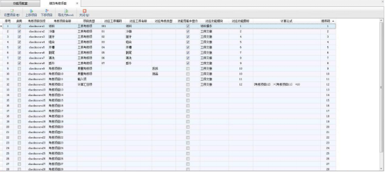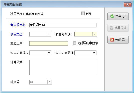 設(shè)置考核項(xiàng)目:在工具欄點(diǎn)擊“設(shè)置項(xiàng)目”,可以打開“考核項(xiàng)目設(shè)置”界面,可以設(shè)置考核項(xiàng)目名、項(xiàng)目類型(工序考核項(xiàng)、質(zhì)量考核項(xiàng)、輸入項(xiàng)、計(jì)算匯總項(xiàng))及考核項(xiàng)目否需要在功能導(dǎo)航中顯示等。如下圖所示: