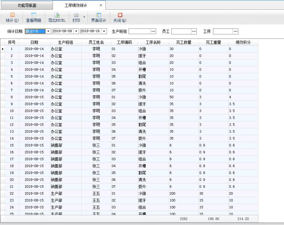 統(tǒng)計(jì):可以根據(jù)日期、生產(chǎn)班組、員工、工序等條件對(duì)工序績(jī)效進(jìn)行統(tǒng)計(jì)。