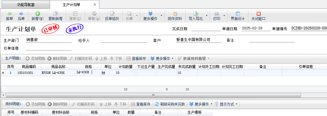 單據明細:錄入本次計劃生產的商品數量、計劃開工日期和完工日期等信息。其他數量不需要錄入,后續通過引用單據的方式,實現執行數量和生產計劃單執行狀態跟蹤。