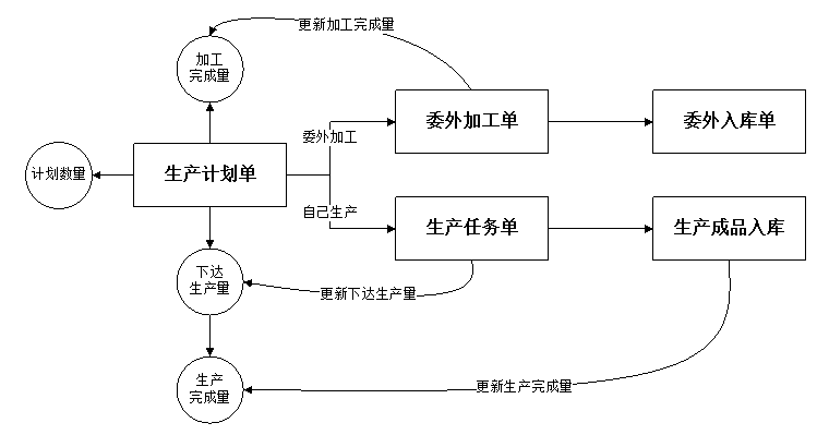 ????② 生產計劃明細中只能輸入計劃數量(即計劃生產數量),其他數量由后續單據執行后自動更新。下圖為不同業務單據更新相應數量示意圖: