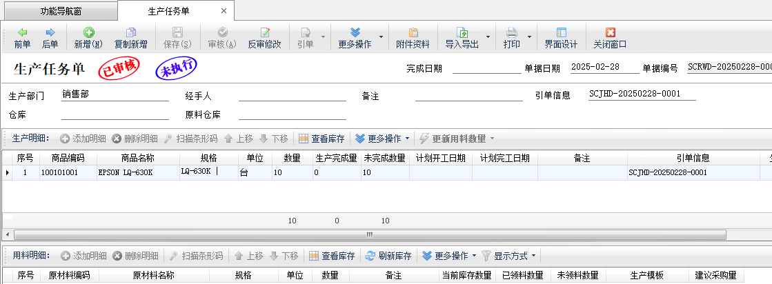 單據明細:引用或輸入生產商品明細后,只需要錄入“數量”,其他數量由后續業務單據引用生成任務單后,自動更新。