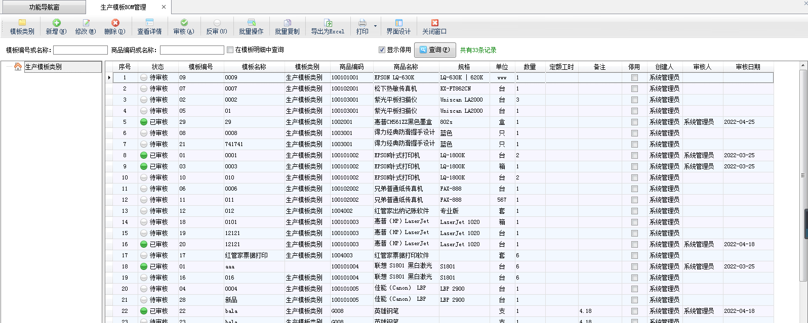????在功能導航窗,點“生產管理”—》“生產模板BOM”,即可進入生產模板界面,如下圖所示: