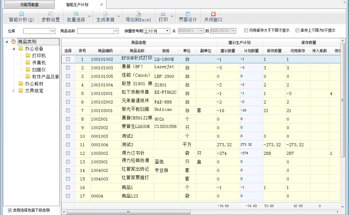 (2)智能分析:點“智能分析”按鈕,軟件會根據參數設置中設置的生產量運算公式計算出商品的“建議數量”,默認“計劃數量”(即后續生成生產計劃單的數量)等于“建議數量”,您可根據業務情況,再手工調整“計劃數量”。