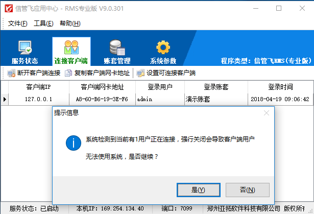 ????點(diǎn)“斷開客戶端連接”按鈕,可以斷開選擇的客戶端連接,對(duì)應(yīng)的客戶端自動(dòng)下線,無法使用軟件。