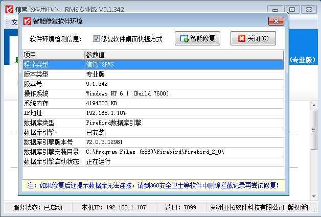 ????數(shù)據(jù)庫引擎服務(wù)顯示數(shù)據(jù)庫引擎的運行狀態(tài),如果數(shù)據(jù)庫引擎無法正常連接,客戶端程序無法登錄,請重新安裝數(shù)據(jù)庫引擎(點菜單“工具”—》“智能修復(fù)軟件環(huán)境”中點擊“智能修復(fù)”按鈕即可重新安裝數(shù)據(jù)庫引擎)。