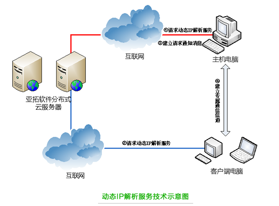 ????動態(tài) IP 解析服務(wù)是亞拓軟件自主研發(fā)的互聯(lián)網(wǎng)遠程連接解決方案,支持通過互聯(lián)網(wǎng)使用軟件,為客戶端與應(yīng)用中心連接提供安全、高效的傳輸通道。啟用動態(tài) IP 解析服務(wù)后,客戶端電腦只要能夠連接互聯(lián)網(wǎng),就可以通過解析賬戶名和密碼連接到應(yīng)用中心使用軟件。動態(tài) IP 解析服務(wù)的簡單原理如下圖所示: