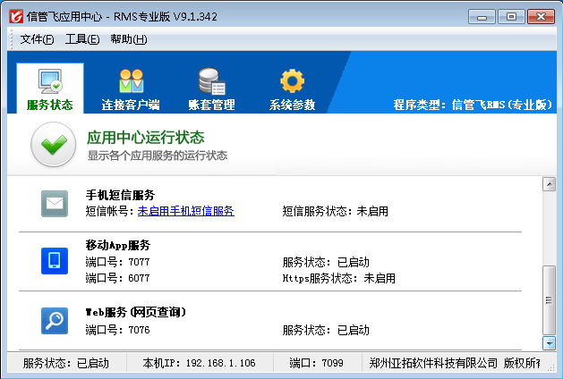 ????應(yīng)用中心的運行狀態(tài)主要包括:軟件授權(quán)服務(wù)、數(shù)據(jù)庫引擎服務(wù)、動態(tài) IP 解析服務(wù)、手機短信服務(wù)、移動 APP 服務(wù)、Web 服務(wù)(網(wǎng)頁查詢)、云打印服務(wù)等。部分服務(wù)在用戶購買了相應(yīng)的擴展功能模塊才會顯示。