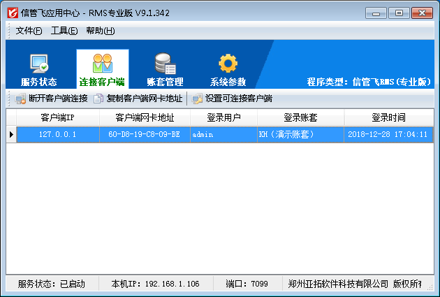 可以管理已連接到主機的客戶端電腦信息,包括客戶端 IP、客戶端網(wǎng)卡地址、登錄操作員、登錄賬套以及登錄時間。