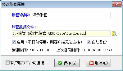????(2)修改:修改賬套屬性時,如果有客戶端已登錄這個賬套,則需要先退出客戶端程序,然后再進行賬套屬性的修改。修改賬套屬性時,可以不啟用賬套(即停用),停用后的賬套客戶端程序無法連接;設(shè)置是否自動備份賬套,如果設(shè)置自動備份,并且系統(tǒng)參數(shù)設(shè)置中也啟用了賬套備份,則軟件會按照賬套備份參數(shù)中的時間間隔定期備份此賬套。