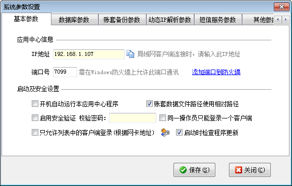 ????系統(tǒng)參數(shù)設(shè)置主要包括基本參數(shù)、數(shù)據(jù)庫參數(shù)、賬套備份參數(shù)、動態(tài) IP 解析參數(shù)、短信服務(wù)參數(shù)、其他參數(shù)等。