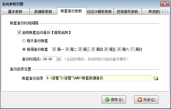 ????賬套備份參數(shù)可設(shè)置是否啟用自動備份、備份時間間隔和備份目錄。我們強烈建議啟用自動備份,以便賬套出現(xiàn)問題的時候從賬套備份文件中恢復(fù)數(shù)據(jù)。