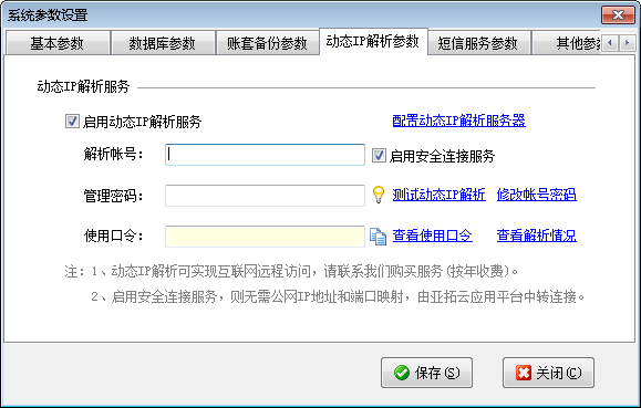 ????解析帳號的密碼分為管理密碼和使用口令。客戶端程序登錄的時候只需要知道使用口令即可。管理密碼在系統(tǒng)參數(shù)配置中使用,由系統(tǒng)管理員掌握即可。