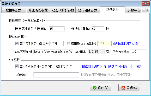 ????Web 服務(wù)用于網(wǎng)頁查詢,如微信業(yè)務(wù)通知中可以直接查看單據(jù)詳情,此外微信支付等業(yè)務(wù)也依賴 Web 服務(wù)接收支付通知。在系統(tǒng)參數(shù)設(shè)置中可以維護 Web 服務(wù)的端口號以及綁定的域名。