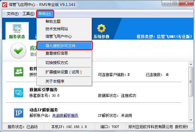 ????在軟件升級(如單機版升級為網(wǎng)絡(luò)版,網(wǎng)絡(luò)版增加用戶數(shù)時),點菜單“幫助”—》“導(dǎo)入授權(quán)文件”,輸入授權(quán)序列號,然后點“獲取授權(quán)”按鈕可以從信管飛云應(yīng)用中心獲取最新的授權(quán)許可。獲取授權(quán)許可信息后,請重啟信管飛應(yīng)用中心程序即可。