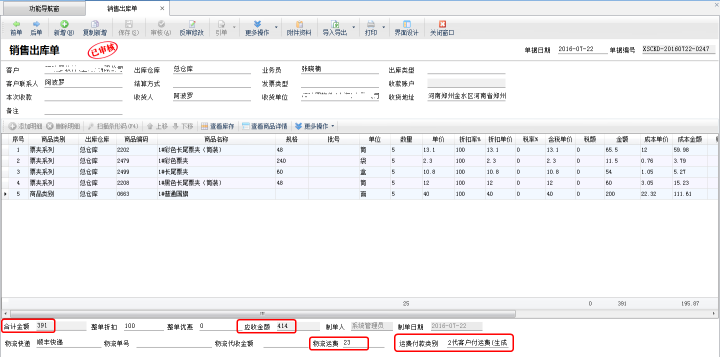 ????1、開銷售出庫單:把單據(jù)信息填好之后可以填上相應(yīng)的物流公司、物流單號以及物流代收金額,通過審核后可進(jìn)入物流代收結(jié)算模塊,如下圖1所示。
