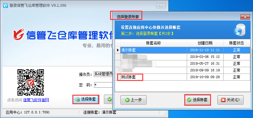 ????運行信管飛倉庫管理軟件客戶端(藍色圖標),在軟件登錄界面點擊“選擇賬套”,在“選擇登錄賬套”界面選擇我們所需要的賬套,然后登錄軟件即可。