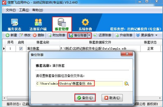 ????設置好備份目錄后,返回至應用中心程序“賬套管理”界面,選擇一個賬套,點擊“備份賬套”可以看到彈出的備份賬套的界面保存目錄為設置的保存目錄“桌面”上,如下圖所示: