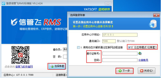????運行信管飛RMS客戶端(藍色圖標),在軟件登錄界面點擊“選擇賬套”,在“選擇登錄賬套”界面選擇我們所需要的賬套,然后登錄軟件即可。