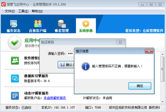 ????信管飛RMS、信管飛倉庫管理軟件、信管飛出納記賬軟件、信管飛送貨單軟件和信管飛票據打印軟件都由客戶端程序和應用中心程序兩部分組成,應用中心可以全面掌控軟件的運行情況,可以隨時查看各類服務的運行狀態,主要包括軟件授權服務情況、數據庫引擎服務情況、動態IP解析服務情況、手機短信服務情況等。下面我們以信管飛RMS專業版為例介紹一下應用中心的服務狀態。