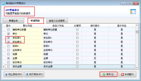 ????需要手機(jī)APP明細(xì)項顯示出“折扣率和折扣單價”該如何設(shè)置?手機(jī)APP的界面調(diào)整需要在電腦端界面設(shè)計“移動端界面設(shè)計”中進(jìn)行調(diào)整,如下圖,打開電腦端軟件,銷售出庫單的界面設(shè)計,選擇“移動端界面設(shè)計”,勾選顯示出“折扣率和折扣單價”。