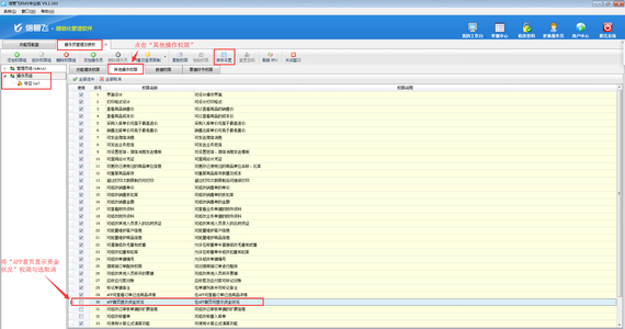 ????在功能導(dǎo)航窗點擊“系統(tǒng)管理”—》“操作員及授權(quán)”,進(jìn)入“操作員管理及授權(quán)”界面,選擇操作員賬號,然后在“其他操作權(quán)限”界面將“APP首頁顯示資金狀況”權(quán)限勾選取消,然后保存權(quán)限設(shè)置,如下圖所示,設(shè)置操作員“張亞”APP首頁不可顯示資金狀況。