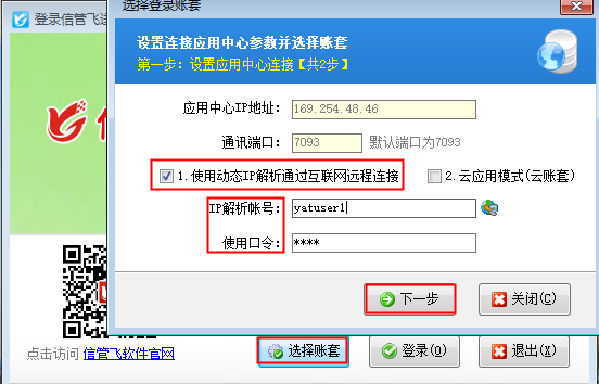 ????客戶端電腦登錄界面“選擇賬套”—》“使用動態IP解析通過互聯網遠程連接”,輸入IP解析賬號和使用口令,點擊“下一步”,選擇賬套,選擇操作員并填寫密碼,進入軟件首頁。