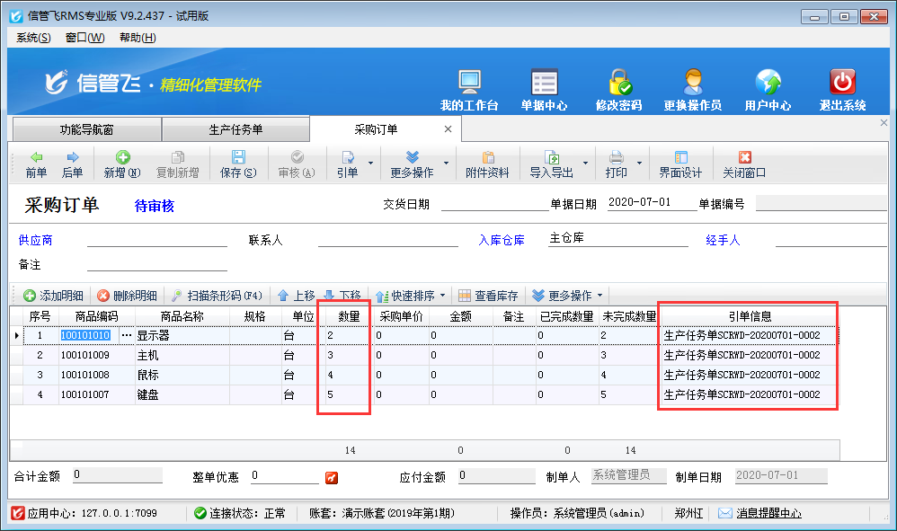 ????①生產計劃單可引用銷售訂單,根據銷售訂單來生成生產計劃。