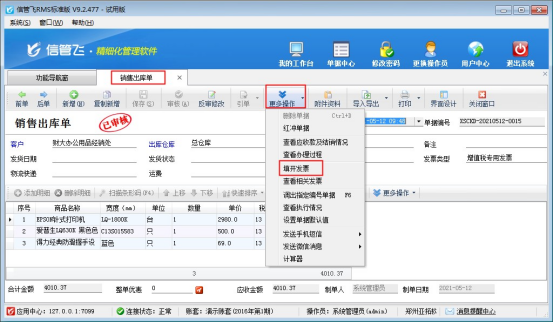 ????在功能導航窗選擇“銷售管理”—》“銷售出庫單”,保存審核單據(jù)后,點擊工具欄“更多操作”下的填開發(fā)票,如下圖所示: