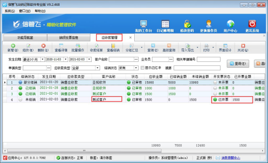 ????銷項發(fā)票信息保存后,返回至應收款管理界面,可看到應收款記錄對應的開票狀態(tài)變?yōu)椤耙验_票”并顯示已開票金額,如下圖所示: