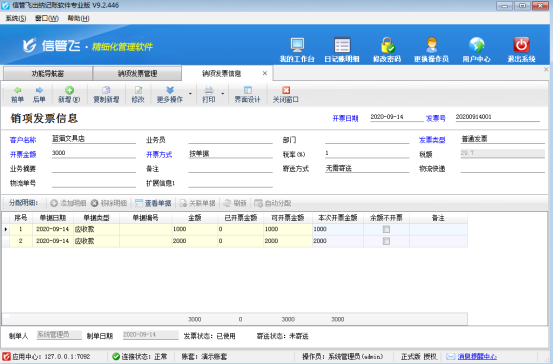 ????發(fā)票審核后系統(tǒng)即可自動更新相關單據(jù)開票狀態(tài),如下圖所示。