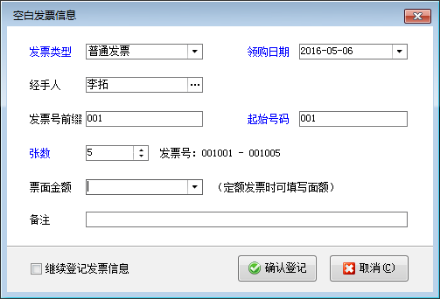 新增記錄:點擊“新增記錄”按鈕,進入“空白發(fā)票信息”窗口,如圖2所示,其中“起始號碼”是必填項,其他內容根據(jù)自己的業(yè)務需要進行填寫,最后點擊“確認登記”即可。