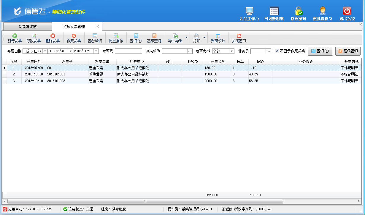 ????企業(yè)在開采購入庫單和銷售出庫單時都存在開發(fā)票的情況,信管飛RMS軟件發(fā)票管理功能可以讓企業(yè)高效快速地管理發(fā)票信息。發(fā)票管理功能支持對進銷項發(fā)票的領購登記、使用(填開、作廢)等整個流程的管理,并能夠全面記錄銷項增值稅專用發(fā)票、銷項普通發(fā)票以及各種進項發(fā)票的開具信息。