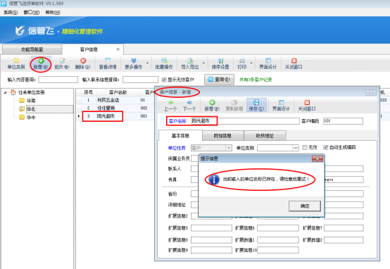 信管飛送貨單軟件支持新增客戶信息,為了避免增加的客戶信息出現重復,軟件支持設置參數不允許客戶名稱重復。 登錄軟件,在“系統管理”—》“系統參數配置”—》“業務參數”中的“數據可否重復參數”把“往來單位名稱可重復”的勾選符號取消,然后保存設置。如下圖所示:圖1 設置完成后,打開功能導航窗的“基礎資料”—》“客戶信息”。新增一個客戶,輸入和之前已有客戶一樣的名稱,保存會提示“當前輸入的單位名稱已存在,請檢查后重試!”,如下圖所示:圖2 歡迎下載試用可設置